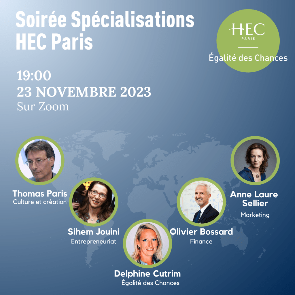 Le programme Égalité des Chances vous invite à une conférence en ligne « spécialisations » avec des professeurs d’HEC Paris le jeudi 23 novembre de 19 à 21h :