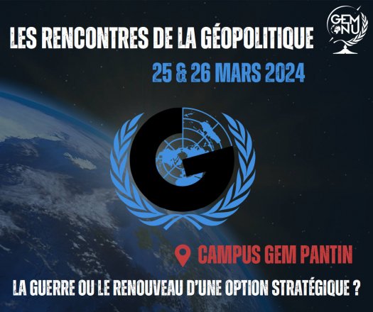 L’association GEM ONU organise les Rencontres de la Géopolitique ! Rendez-vous dans le campus de Pantin afin de suivre les conférences sur le thème « La guerre, le renouveau d’une option stratégique ?« . L’entrée est gratuite mais avec inscription obligatoire en cliquant ici. Pour connaître le programme détaillé suivez ce lien en cliquant ici.