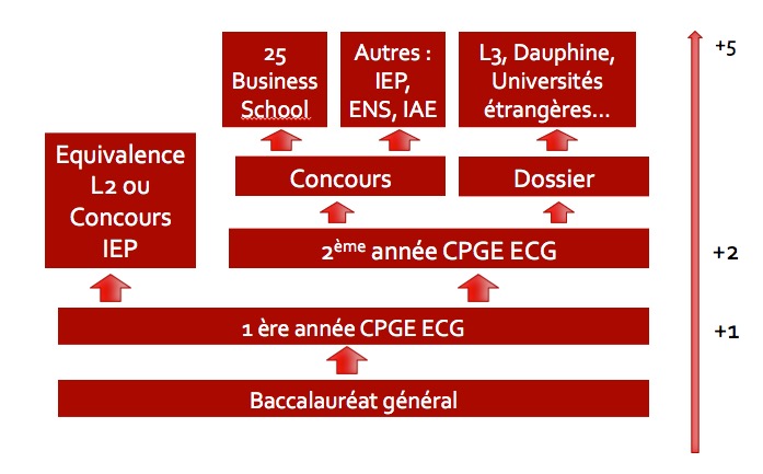 - A l’Université : On peut également s’orienter à l’université après une classe préparatoire sans « perdre » une année. On entre en Licence 2 après une première année de classe préparatoire ou en Licence 3 après une deuxième année de classe préparatoire. La plupart des étudiants rejoignent un cursus en économie-gestion, AES, LEA, MASS.